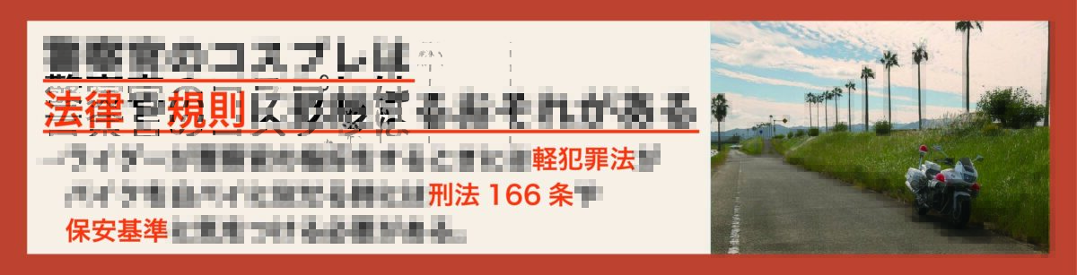 そのため、警察の格好を模した姿でバイクに乗ることは、軽犯罪法に抵触する恐れがあるといえます。