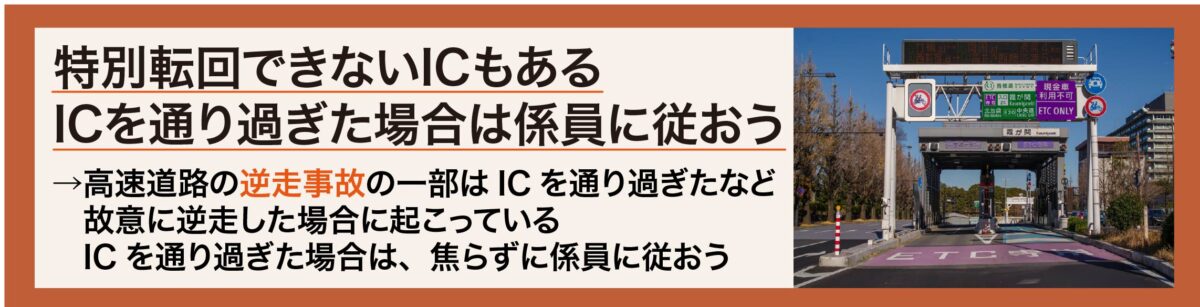 ただし、だからと言ってその場で転回しようとしたり、元のICに戻ろうとするような行為は避けなければなりません。