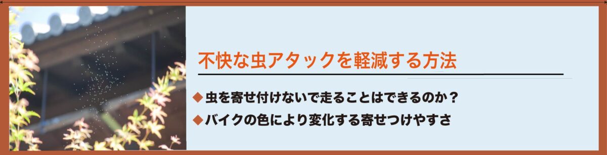 吸血昆虫は動物の発する熱や呼気に寄ってくるため、動物と誤認することが虫がバイクに向けて飛来する一因になると言われています。
