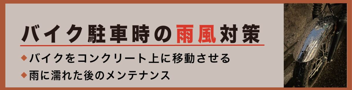 たとえ数分バイクから離れる場合であるにしても、雨や強風から車体を保護するために即座にカバーをかける、軒下に移動させるといった対処法があります。