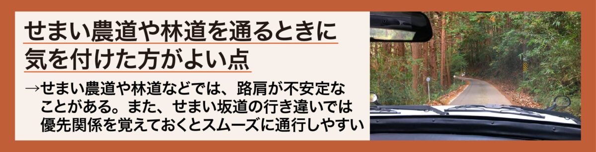 農道や林道は、農林業を円滑に行うことを目的に整備されており、その道路幅は一般的な道路よりも幅が狭い場合があります。