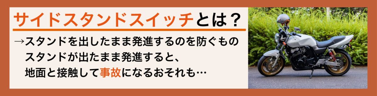 上述の通り、サイドスタンドスイッチは、本来スタンドのしまい忘れによる事故を防ぐ目的で設けられたものです。