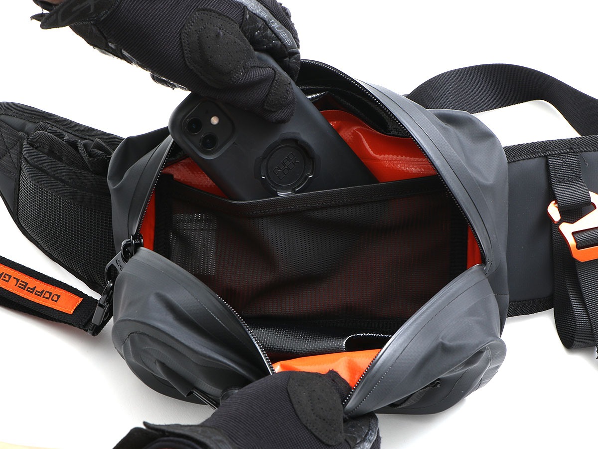 ボディー/レッグの2WAYで使えるホルスターバッグ。長財布も収納できる容量に加え、外側メッシュポケットとドローコードを備えているので、グローブや小物の“ちょい掛け”にも便利です。走行中のバタつきを抑えつつ、必要なものにサッとアクセスしやすいのが強み。ポケット不足に悩むライダーの味方です。