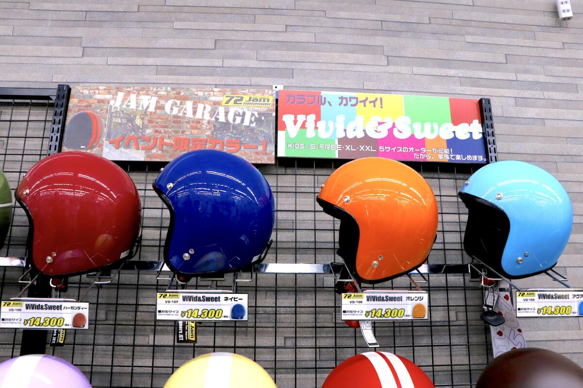 近頃は売れ筋の白、黒、マットカラーなどのシンプルなものを展示している用品店が多いけれど、72Jam(ナナニージャム)のヘルメット売り場は明るく楽しい気持ちになれます♪