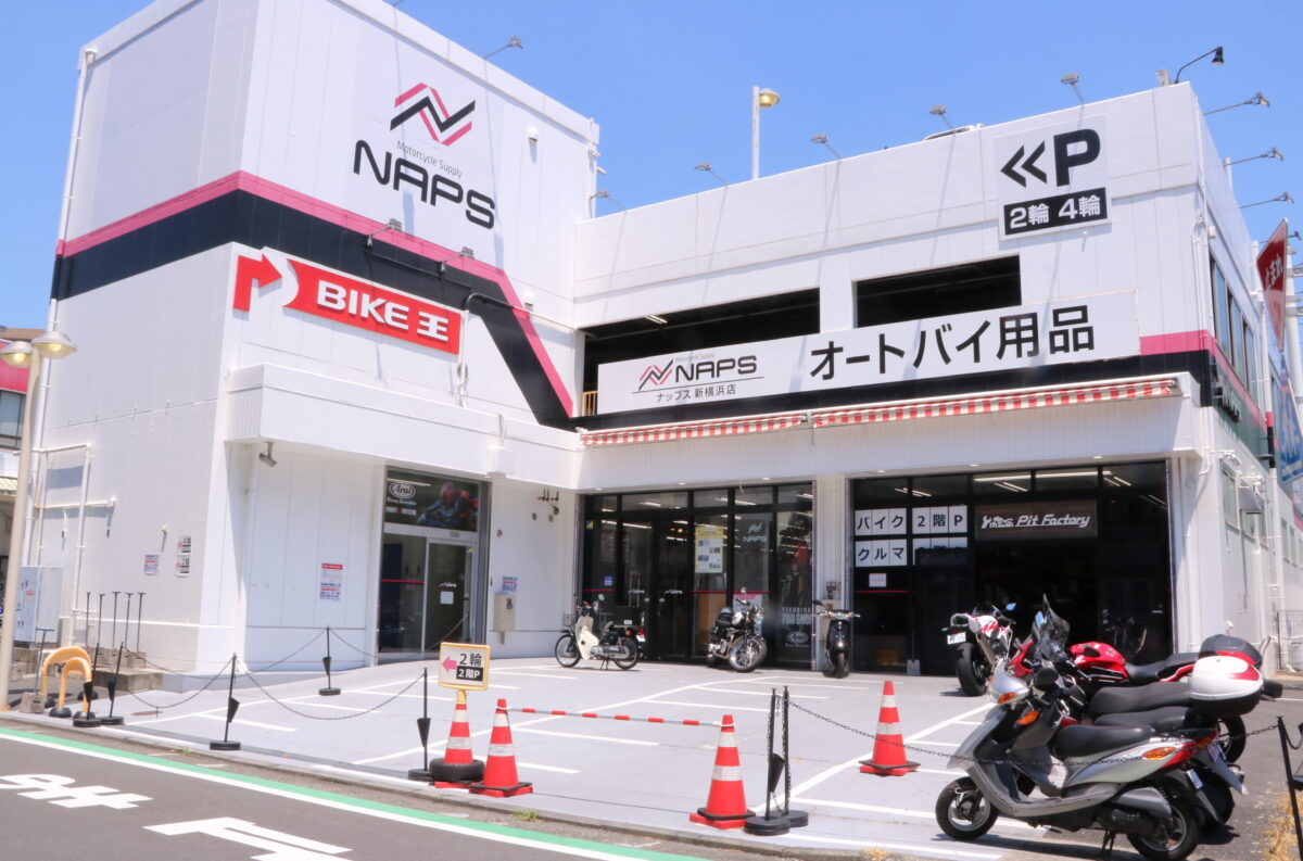 訪れたのは2021年6月にオープンした「ナップス新横浜店」。都市開発の進む新横浜駅から徒歩圏内にお店を構え、交通網も充実しているのでアクセス良好! 2輪・4輪駐車場も広々と完備されていました(お店の隣に立体駐車場もあります)。