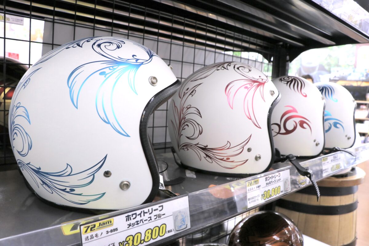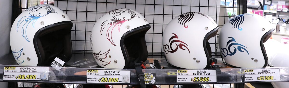 そして女子ライダー目線でハートを奪われたヘルメットは……、「ホワイトリーフ」(左2つ)と「KAIUN」(右2つ)。