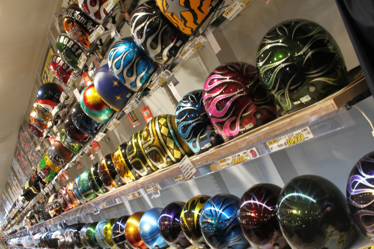 100を超える数(※)の個性派ヘルメットがズラリと並ぶレイアウトは一見の価値アリ。