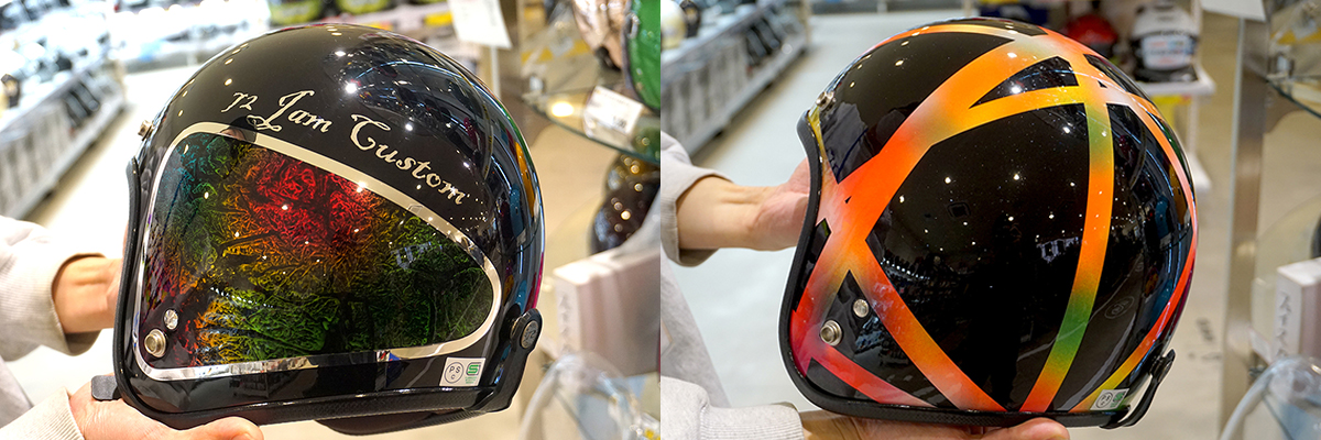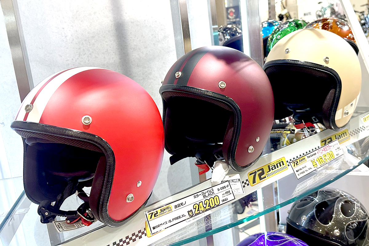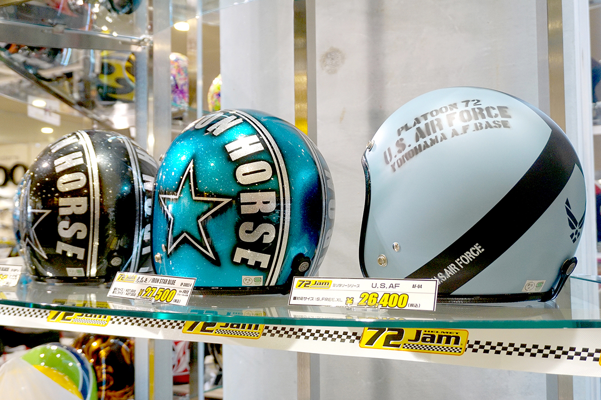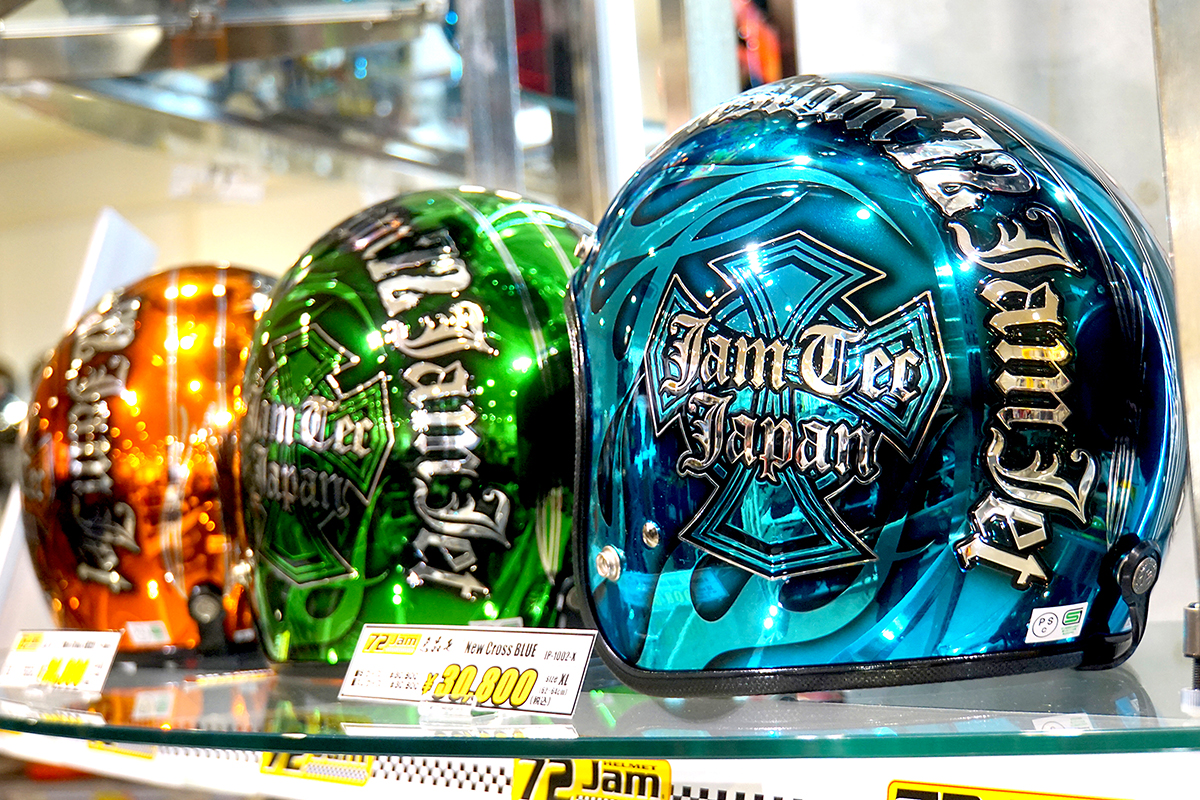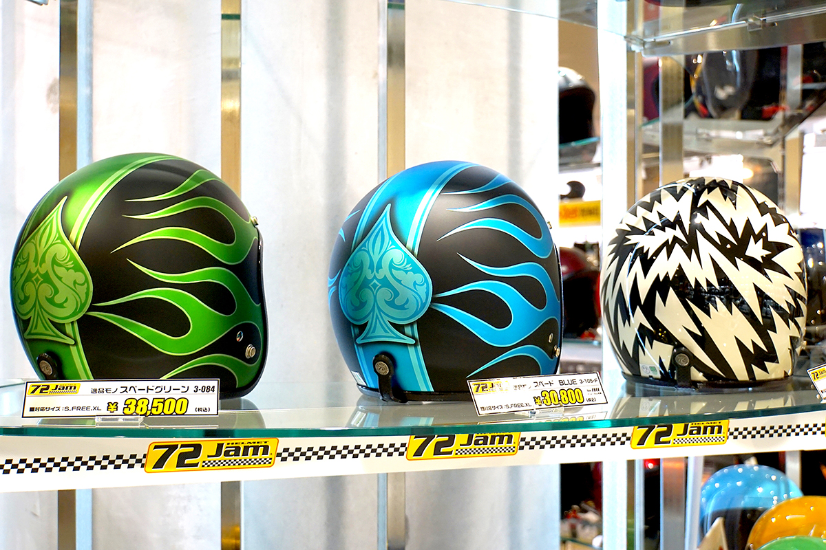 72Jamのヘルメットといえば、メッキ調やハンドペイント風などの個性的でクオリティが高いジェットヘルメットを数多くリリースしているブランド。その製品がこれだけ数多く並んでいる様子は圧巻だ。