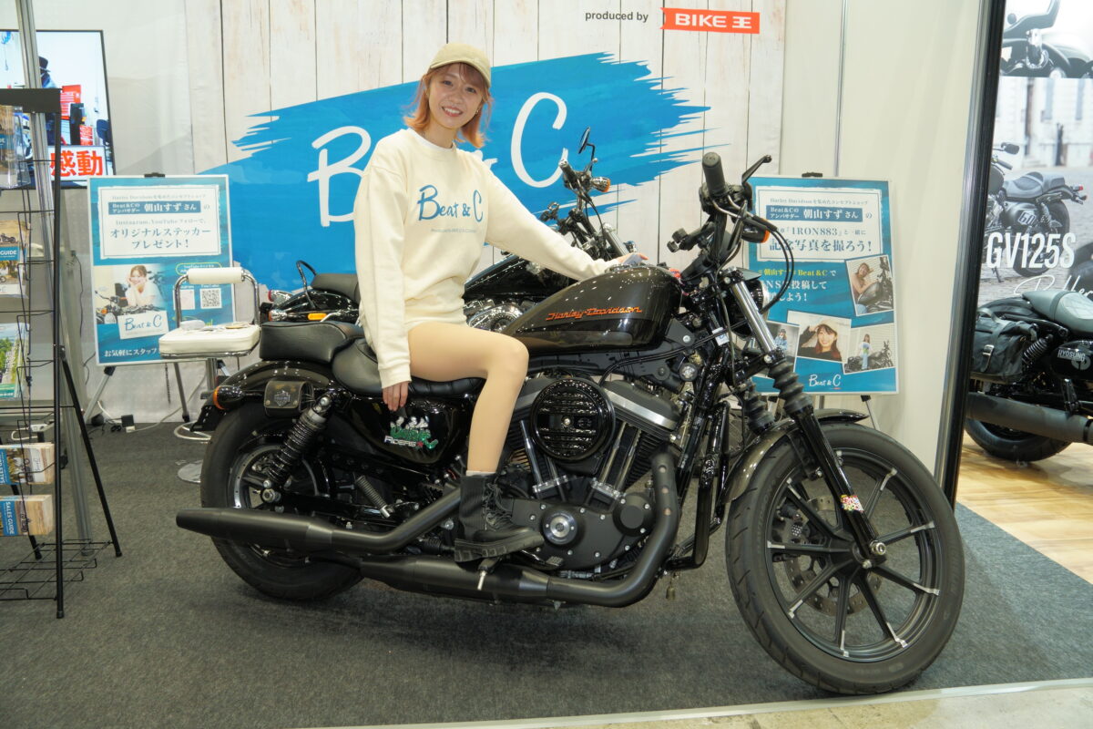 モーターサイクルショーでは彼女の愛車XL883Nも展示され撮影会も実施。