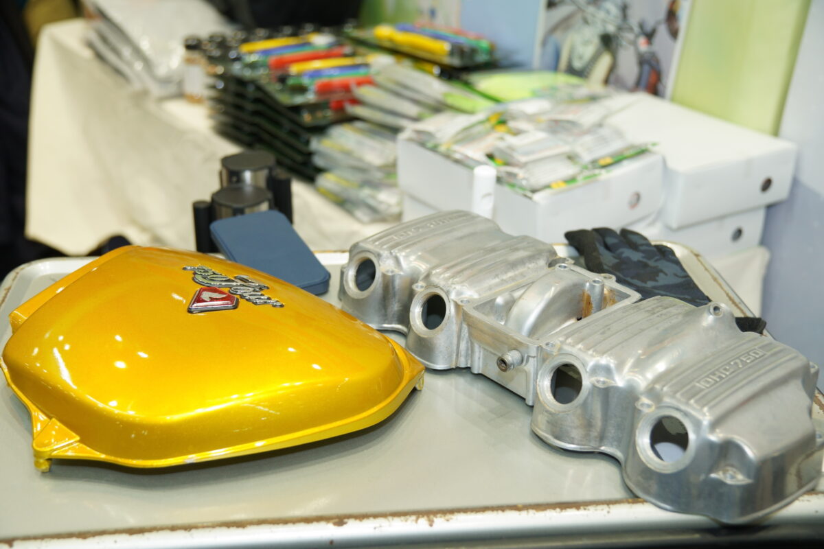 美しいRZ350も、よく見ればエンジンの腰上部分は3Dプリンターで制作されたもの!?耐久性のテストはこれから行っていくとのことで、非常に気になるところだ。