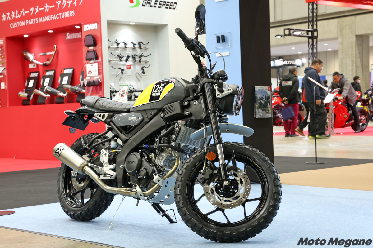 153ガレージのブランドローンチを飾った2023年のホンダ・GB350Sおよびカワサキ・Z650RSはカフェレーサー路線だったが、2024年はスポーツヘリテージのヤマハ・XSR125をベースに、初のスクランブラーカスタムにチャレンジ。153ガレージ×SWモテックの「アップフェンダー(予価1万9800円)」や153ガレージの「ヘッドライトガード(予価1万3200円)」など、参考出品アイテムも多く使われている。