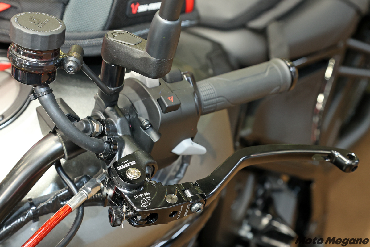 純正のパーキングブレーキレバーを移設して、スポーツスクーター向けに開発されたピストン径14mm の左手用ブレーキマスターシリンダーを装着。同じくゲイルスピード製の「サムブレーキ用リアマスターシリンダー Φ12(2万8600円)」も使用し、これに左手側マスターからのブレーキラインを接続することで、手と足のどちらでもリアブレーキが操作できるようになっている。