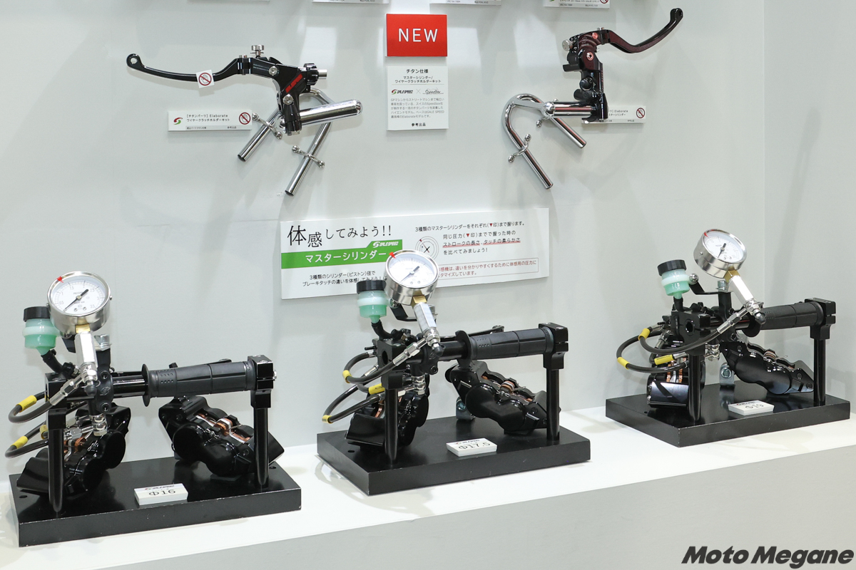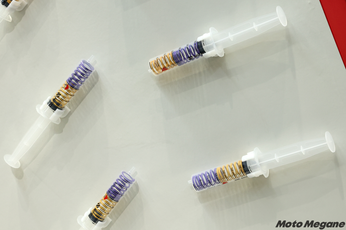 今回用意されたのは4種類。ゲイルスピードの「マスターシリンダー体感機」は、ピストン径が異なる3タイプのマスターシリンダーを同じ力で握ったときの、フィーリングの違いを体験できる装置。同じくゲイルスピードの「ホイール体感機」は、重量が約0.9kg異なるゲイルスピードのTYPE-SB1(3.29kg)と純正ホイール(4.18kg)で、回しはじめの軽さや止まりやすさなどを知ることができた。アクティブの「パフォーマンスダンパー体感機」は、パフォーマンスダンパー付きとリジッドバー付きとフレームのみのテスターをハンマーで叩き、振動の強さや収束速度の違いを知ることができる装置。そしてハイパープロの「スプリング体験機」は、注射器の中に同社が独自設計するコンスタントライジングレートスプリングが入れられており、これを縮めることにより“底で踏ん張る”という特徴を目で見ることができた。