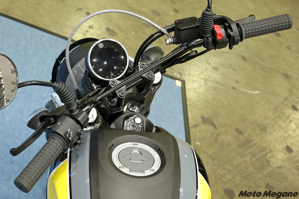 「VMX」はヴィンテージモトクロスの意味。ブレースが溶接された、トラディショナルなスクランブラースタイルのスチール製バーハンドルだ。XSR125の場合、グリップ位置は純正比でアップ10mm/バック50mm。ブラックは2024年5月発売予定で、ショーブースにはメッキタイプも参考出品されていた。