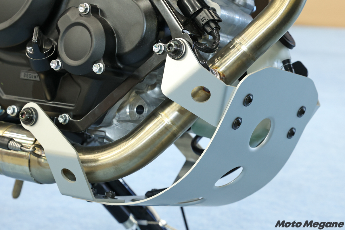飛び石からエンジン下部をガードする、アルミ製シルバーアルマイト仕上げのスキッドプレート。エッジが丸められたプレス加工のホールで、クラシカルな雰囲気を演出。純正よりもシンプルなデザインで、スクランブラーらしさを強調する。こちらは2024年5月に発売開始予定だ。