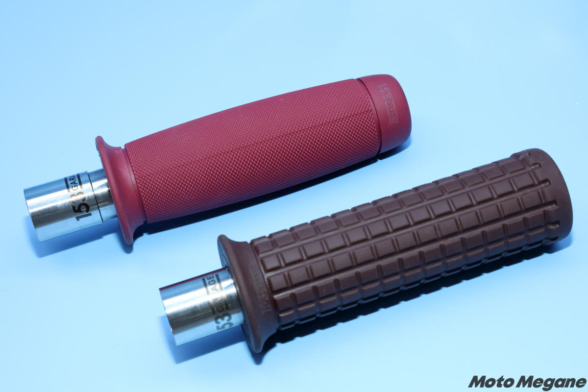2024年夏発売予定のレトロな新作グリップ。滑り止めが細かい樽型と、ブロックパターンが特徴的なブロックSがある。どちらも長さは125mmで、Φ22.2mmの非貫通式が基本だが、ブロックSのみ貫通式のΦ22.2mmとΦ25.4mmも用意される。ブラック/ダークレッド/ブルー/ブラウン/ダークブラウンの5色設定。