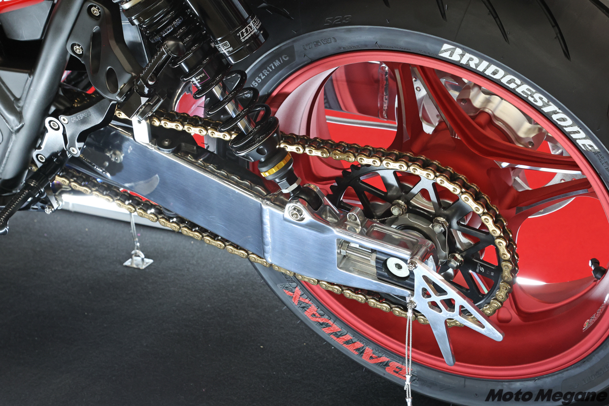 理想の剛性としなりを得るため、メインチューブの角パイプ材から設計。専用の押し出し金型を製作して、最適な材料を完成させた。オールドネイキッドらしいダイナミックな走行感覚を追求。スロットル操作に対する反応がよりダイレクトになる。重量は5.1kgで、ダエグ純正より0.5kg軽い。