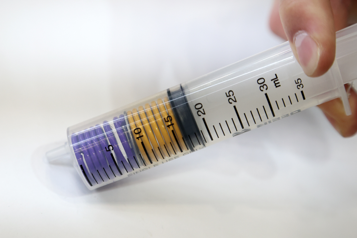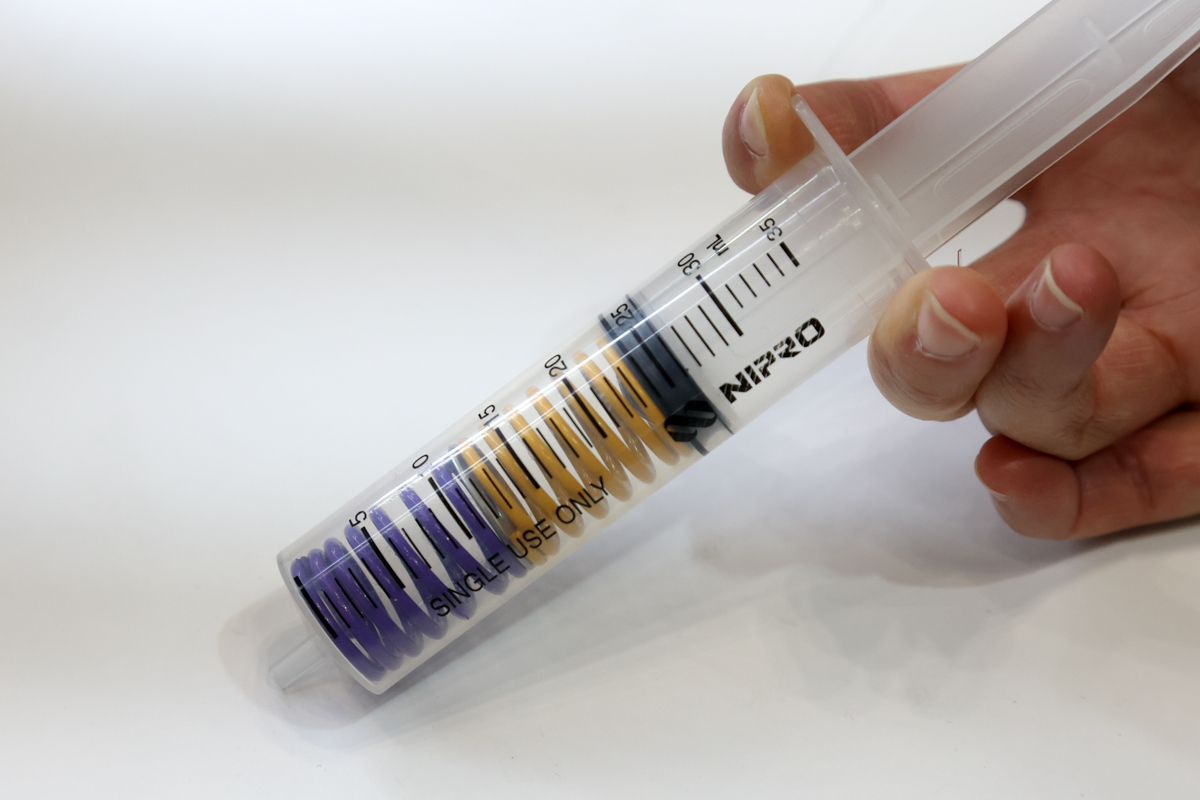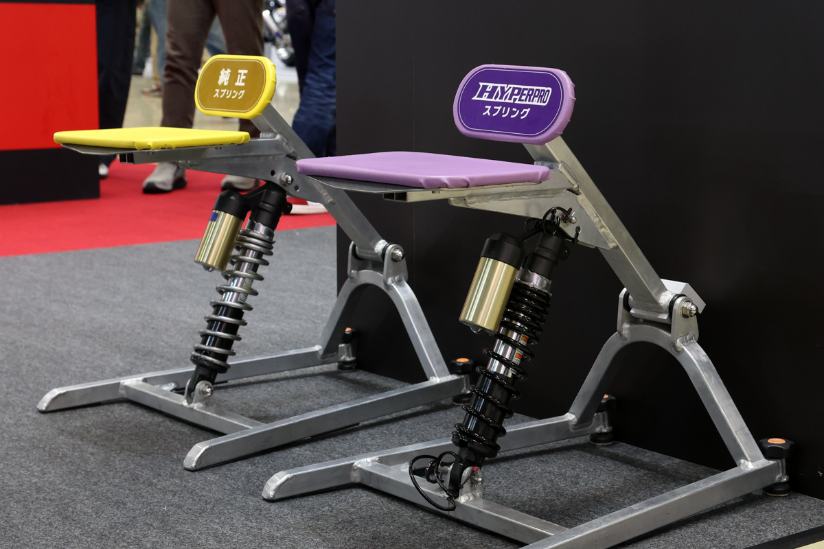 例えば、ハイパープロの注射器型スプリング体感機は、スプリングを大きく縮めていったときに、シングルレートスプリング(黄色)が完全に潰れた状態でも、ハイパープロ独自のコンスタントライジングレートスプリング(紫色)が踏ん張っている様子を観察できる。ハイパープロの体感機にはイス型もあり、こちらは純正スプリングとハイパープロ製スプリングの違いを、実際のライディング時のようにお尻で体感できる。沈み込み初期の柔軟さだけでなく、戻り方向のしなやかさや、奥まで沈ませたときの踏ん張りがわかりやすい