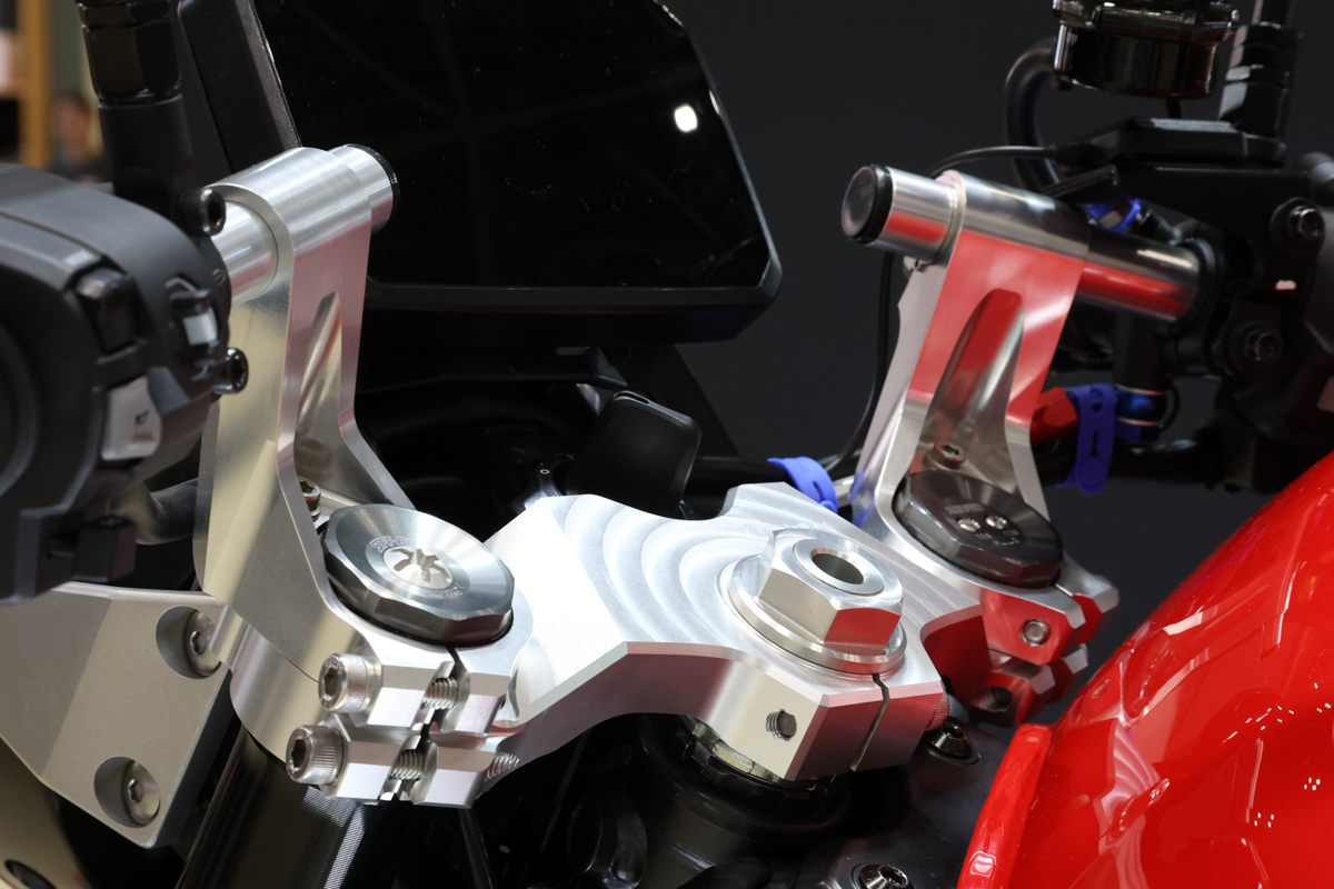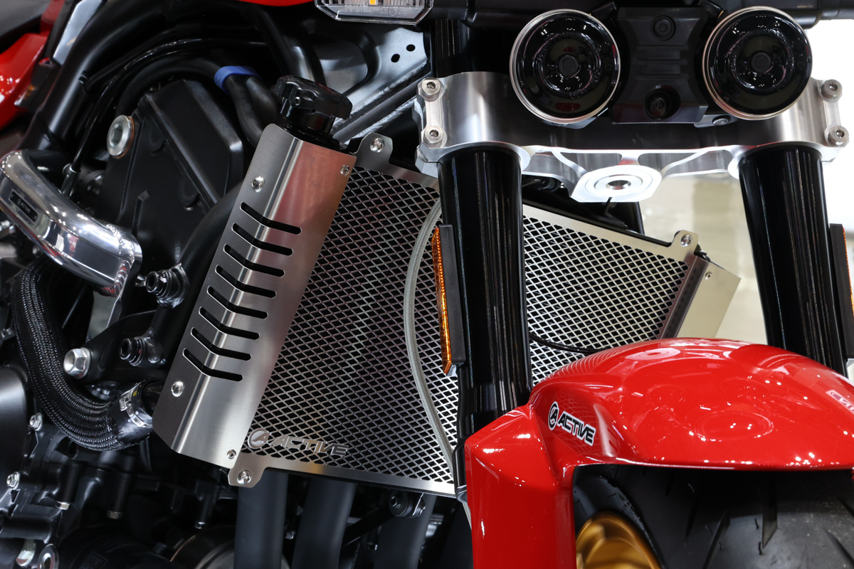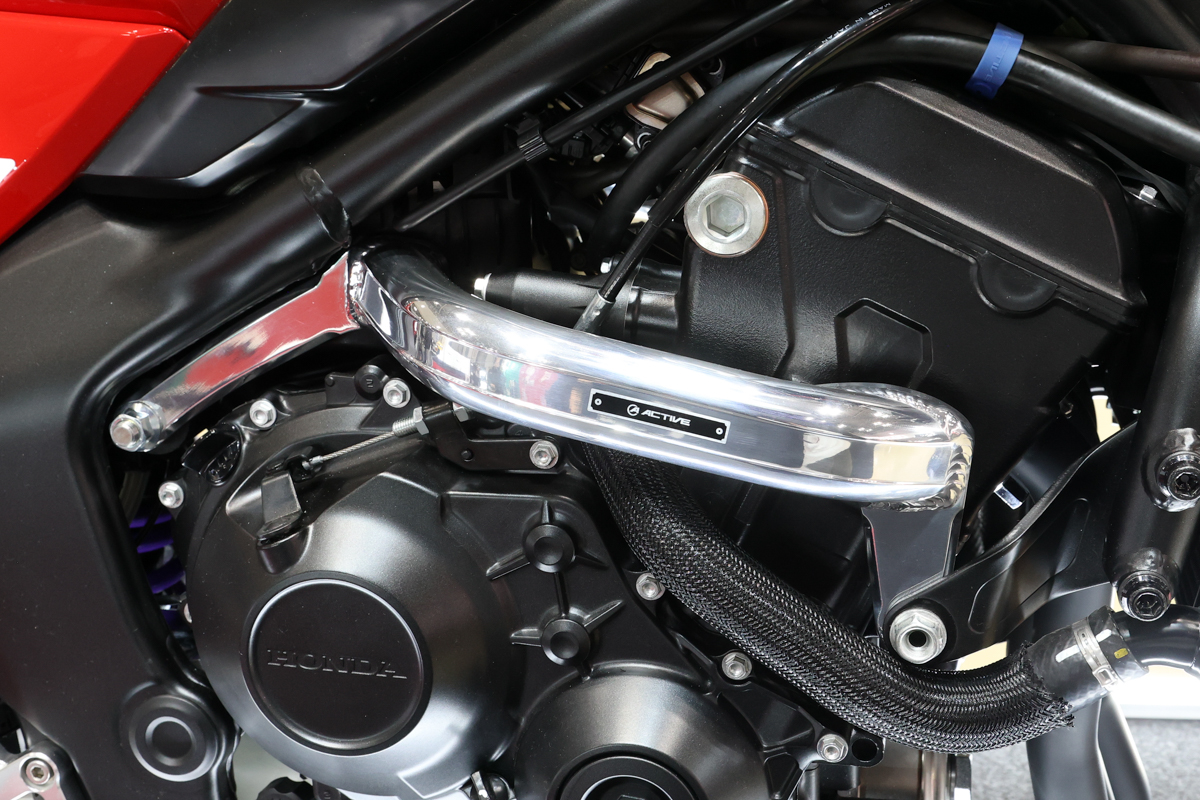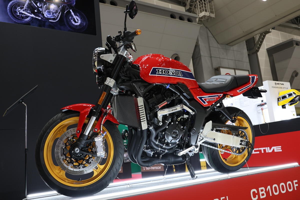 2025年11月に新発売されたホンダのCB1000Fを、ストリートシーンを意識しながらアクティブがカスタマイズ。最新のショーモデルとして初披露された。すでに市販されている「コンバーチブルステムキット(セパレートハンドル仕様)」は、ストリートスポーツに最適な剛性を意識しながら、車体のトータルバランス向上をコンセプトに開発。可変オフセット機構を搭載し、ライダーの好みや求める操縦性に応じて微調整できる。CB1100F 系の純正クリップオンハンドルをオマージュしつつ、セパハンながら乗りやすいポジションと、敢えて2D 切削加工を用いることでエッジを効かせたルックスも特徴とする。