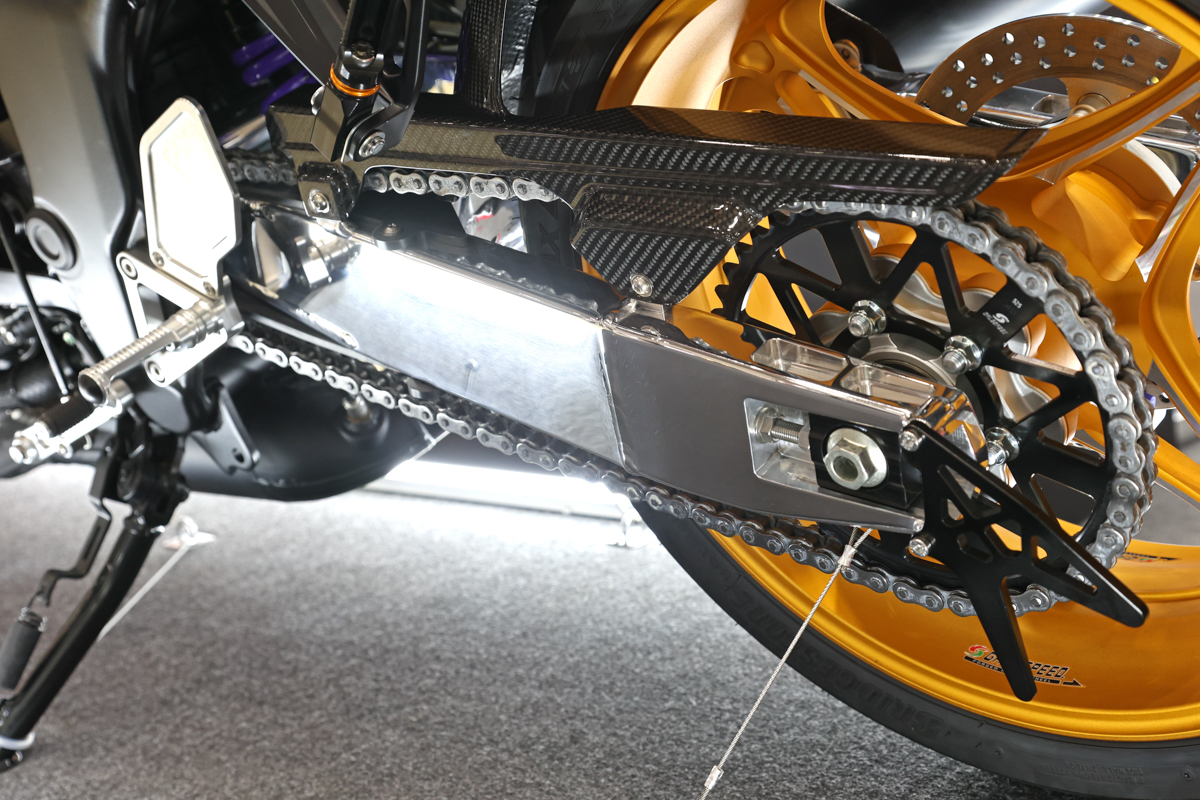 開発中のアイテムでとくに注目しておきたいのが「サブフレーム」。車体の剛性バランスを保ちつつ、コーナリングやブレーキングなどで車体の動きを引き締める。左右均等になるよう設計された、こだわりのシルエットも魅力だ。この他、「口の字断面スイングアーム」も開発中のパーツとして披露された。