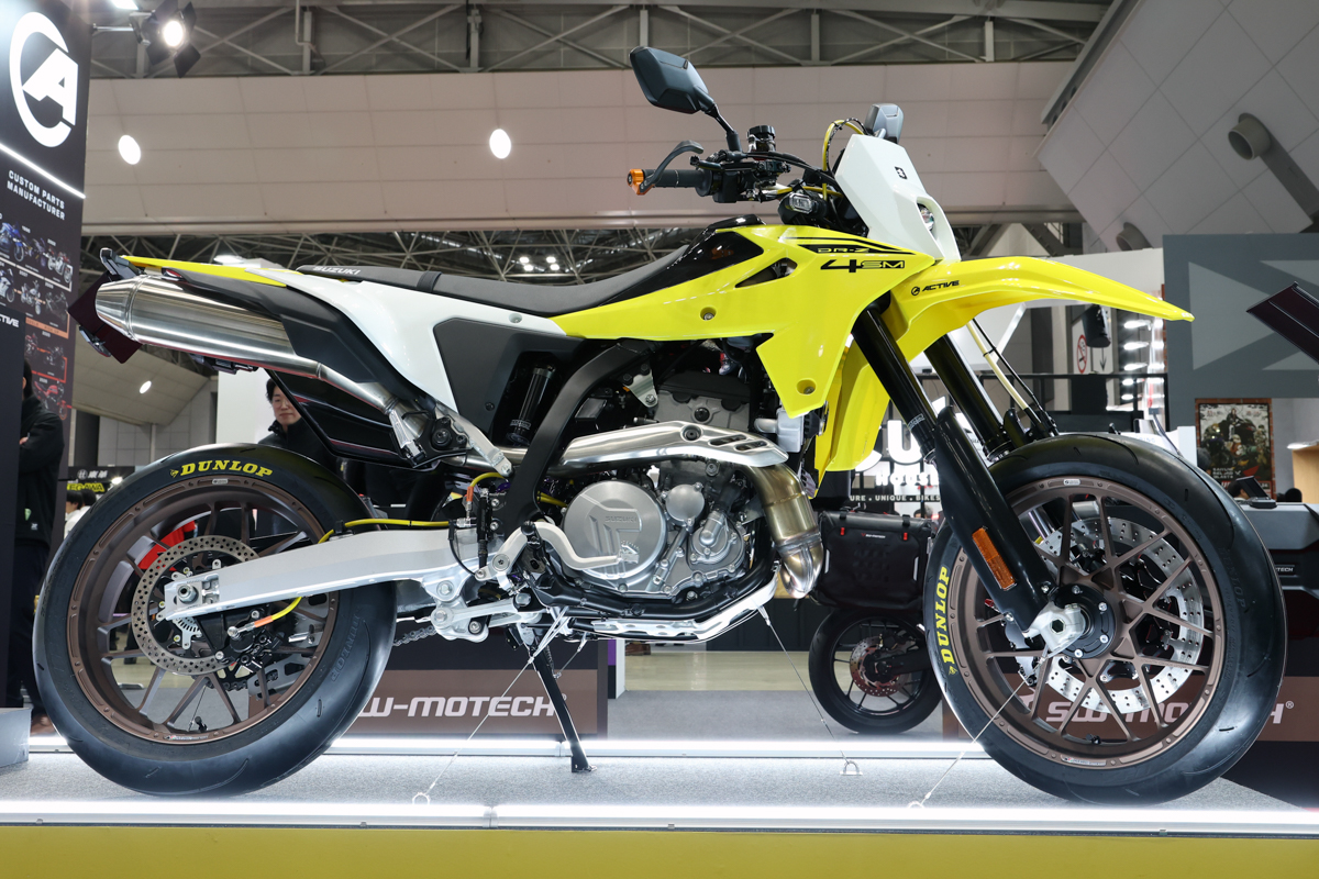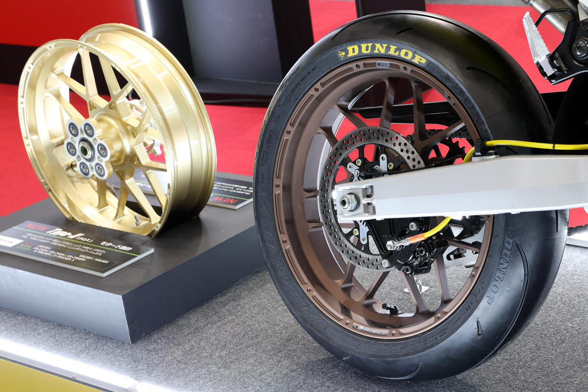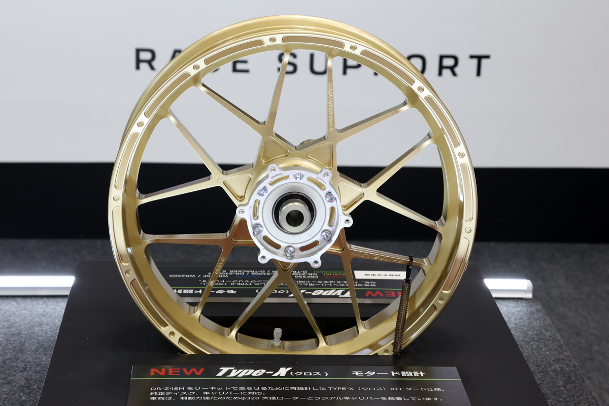 今回のショーでは、昨年登場したスズキのDR-Z4SMに装着した状態でも展示。Type-Xへの換装により前後タイヤをチューブレス化できるため、フロントで0.2kg、リアで0.6kgの軽量化も図れる。なお、純正タイヤサイズは140/70-17だが、Type-Xは140/150/160サイズが履ける。また、オプションとして全15色のカラーアルマイトなどが用意されており、車両に装着されていたカラーもそのひとつとなる。