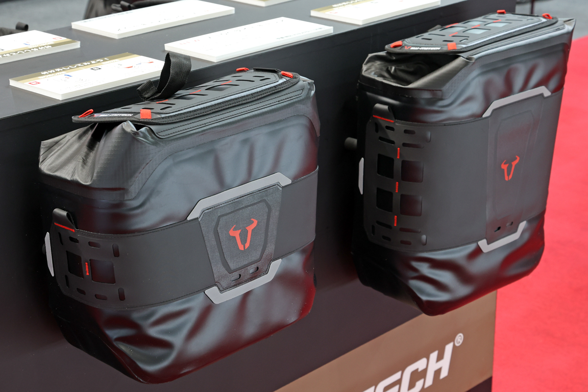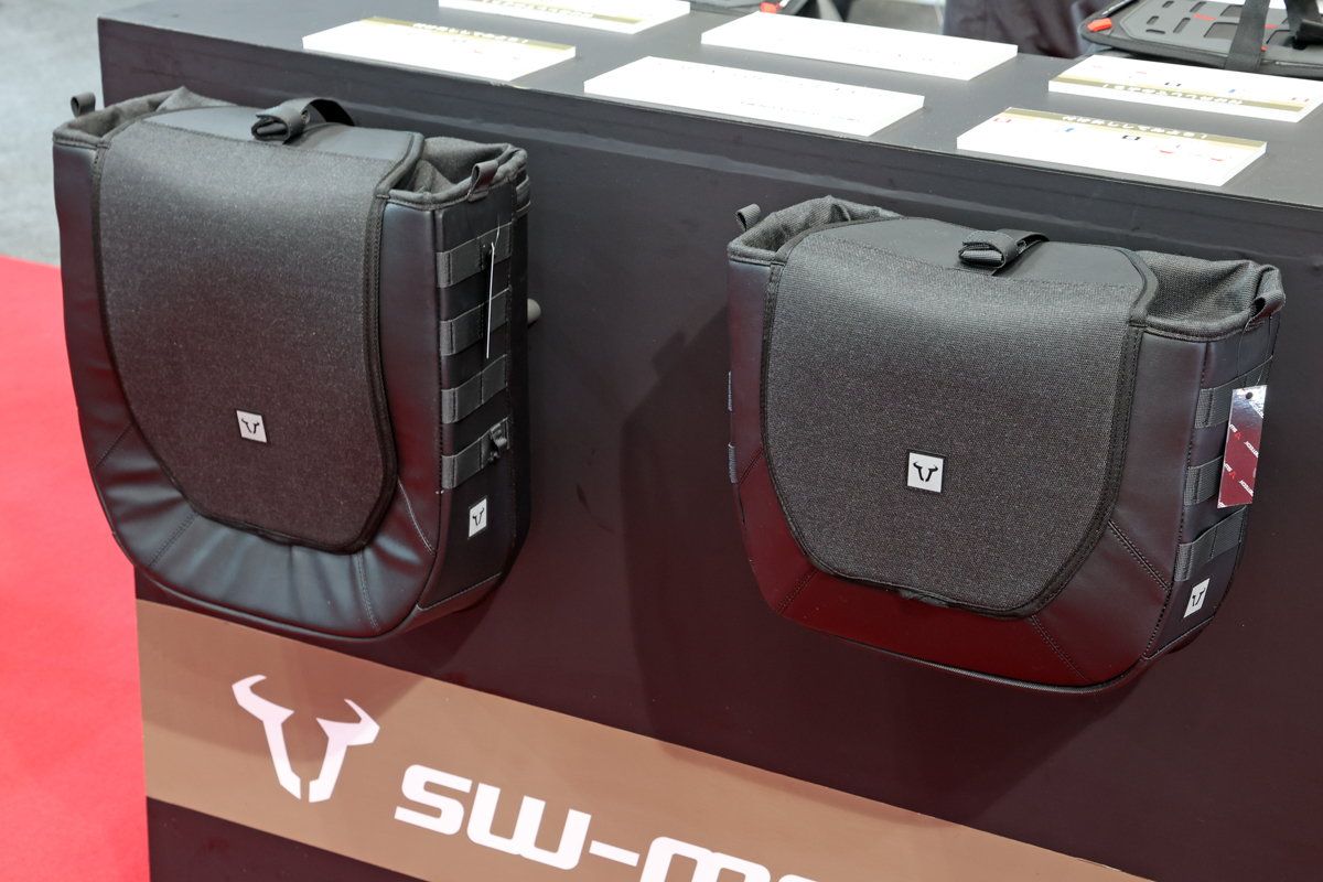 今回のショーでは、キャリアのベース部に装着された状態で、完全防水仕様の「SIDE BAG WP(サイドバッグWP)」とシンプルでクラシックな雰囲気の「LEGEND GEAR(レジェンドギア)」という、2タイプのサイドバッグを展示。実際に着脱を試すこともできたが、マジで超簡単に着脱できるのに固定は強固だった!!