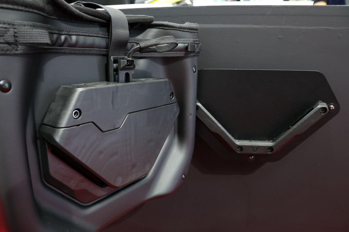 ツーリングバッグ&キャリアなどを展開するSWモテックの新機構となるV-LOCシステムは、「安全性を損なわずにバッグの着脱を極限まで簡単にすること」が開発コンセプト。サイドバッグの荷重に耐えられる強力マグネットと広い支持面積を持つロック機構で、高い固定力を実現し、磁力のガイドにより片手でも簡単にバッグを取り付けできる一方、バッグ裏側のタブを引っ張るだけで瞬時にバッグをキャリアから取り外せる、画期的なシステムだ。