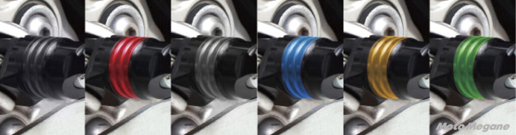 別売りのオプションパーツとして、ステップバーの位置を360度でオフセット可能なオフセットカラー、位置を5mmまたは10mm外側にする延長カラーが設定され、いずれも6色のが用意されている。