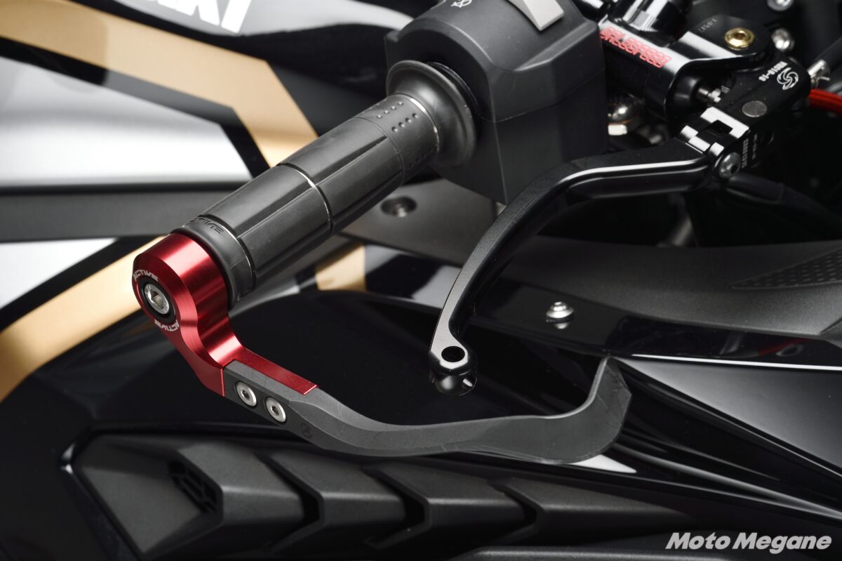 製品の目的が意図しないブレーキングを防ぐためで、転倒時にレバーを保護することは念頭にしていないからです。そのあたりが、転倒時に車体などへのダメージを少なくする役目を持ったスライダーなどの保護パーツと大きく違う点でもありますね。
