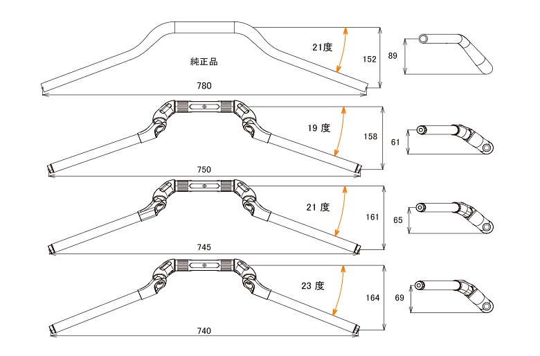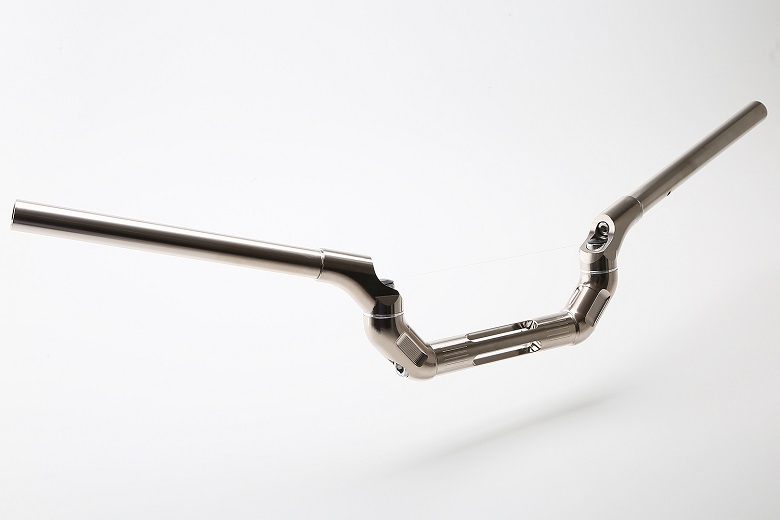 ところが、この可変ハンドル、その名の通りハンドルの絞り角を可変させることができ、純正ハンドルの21°に対して、19°・21°・23°の3段階から選択することが可能。角度調整に伴い、ハンドル幅も最大で40mm狭くできる。また、ハンドルを手前に倒せば垂角も作れるという、ライダーの体型や好みに合わせて簡単にアジャストできるスグレモノなのだ。これならばライダーとバイクの『人馬一体』感がよりイージーとなり、理想のライディングポジションを追求することができるのだ。