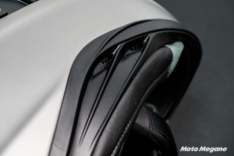 額の部分と口元に大型のダクトが一か所ずつ配置されています。口元のダクトはシールドの曇りを抑える効果があるとのことですが、猛暑が予測されているので涼しさも期待したいところ。