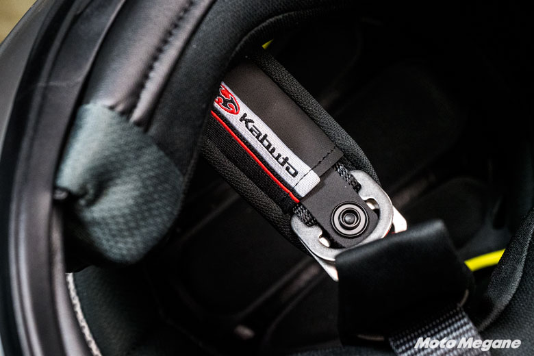 Kabutoのロゴは額と後頭部、それと顎ひもの部分にも一か所入っており、右耳の下部分にはエアロブレード6のロゴが入っています。