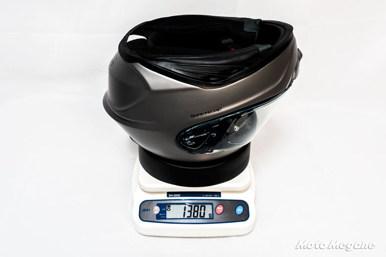 今回はエアロブレード6のフラットクールガンメタ、Mサイズを図ってみました。結果は1380g。色々なフルフェイスヘルメットの重さを測定した経験がありますが、1400gを下回るものはかなり軽量です。