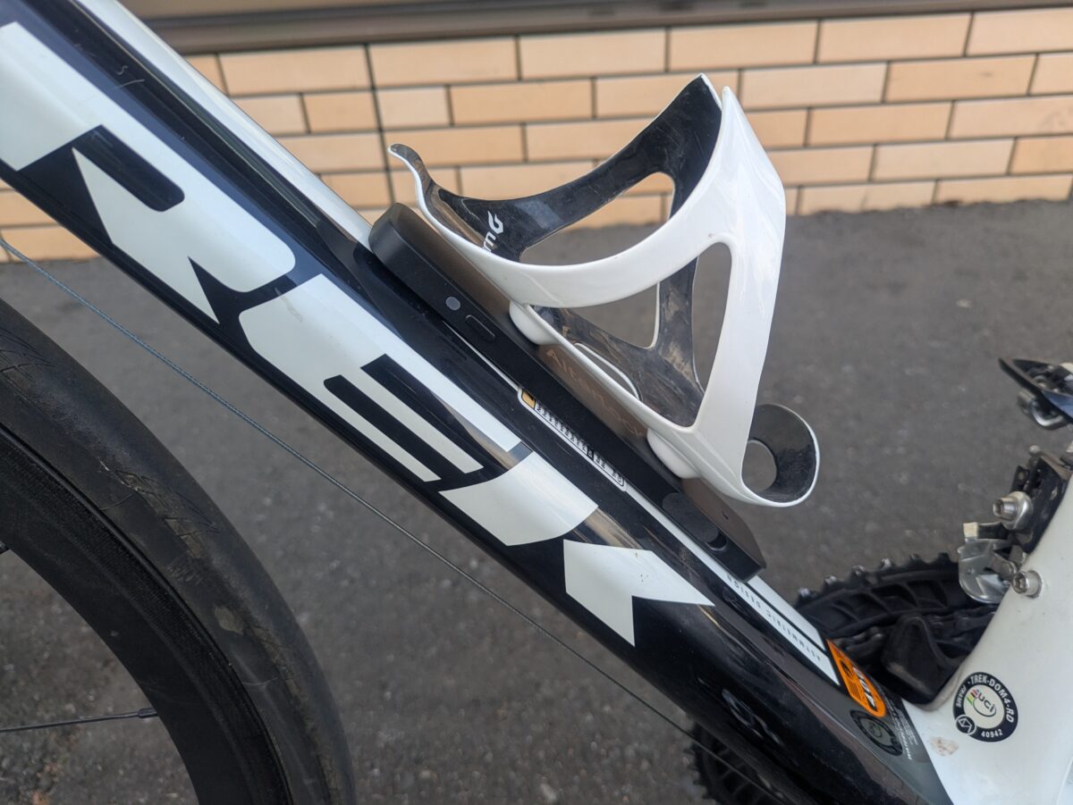 またオルターロックは自転車の防犯にも有効だ。本体には2カ所にボルトの穴が空いており、これがロードバイクのボトルケージの穴位置に合うように設計されている。フレームとボトルケージの間に本体を挟むと一体化し、とても防犯システムがついているようには見えないのだ。
