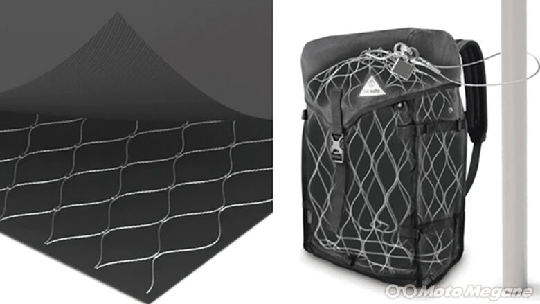 バッグ生地全体には、ステンレスワイヤー(360°Xomesh(エキソメッシュ))が埋め込まれているため鋭利な刃物等でも簡単には切り裂けれず、バックパック自体が簡易金庫のような役割を担う。また、盗難防止に加え、不意の転倒でもバックパックが大きく破け中身がこぼれ落ちるのを防いでくれる。