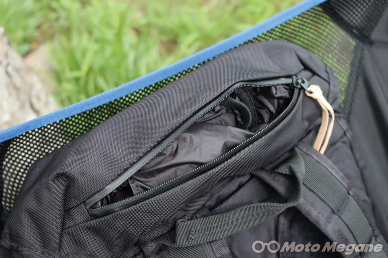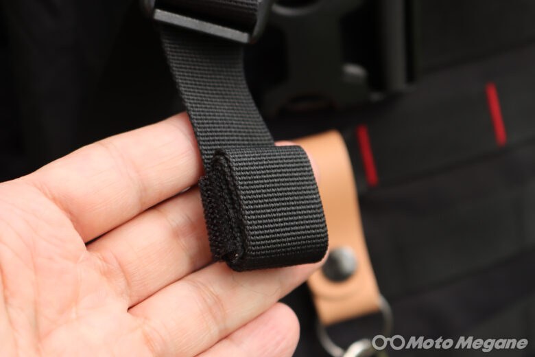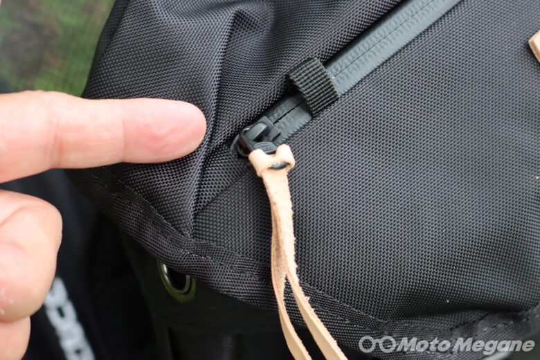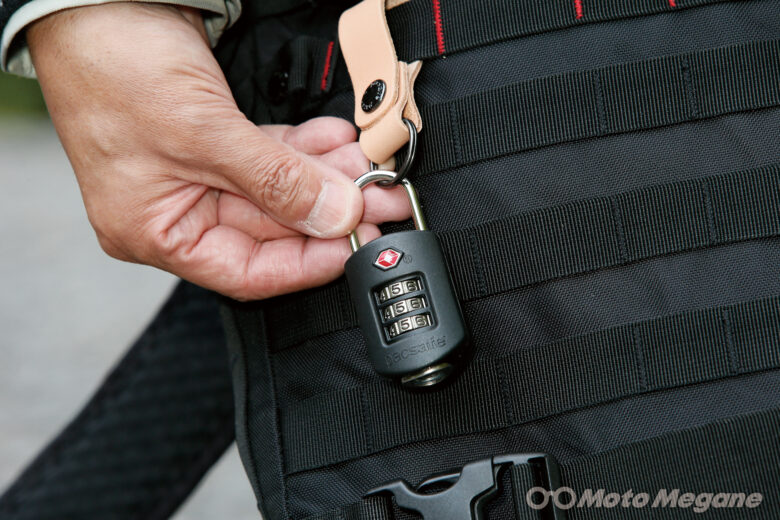 バックパックの口にはケーブルが通されており、ケーブルを締め上げることでバックパック内部をがっちりガード。そのケーブルをバイクのフレームやヘルメットホルダーなどに通して固定すれば、置き引きなどの盗難対策ができる。