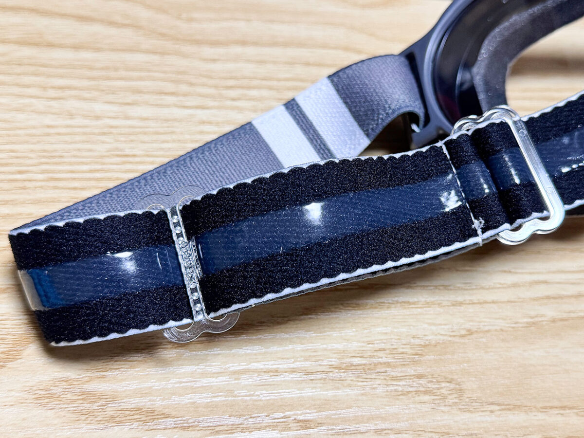 ベルト裏側には滑り止め素材がぐるりと一周施されており、バイク用ヘルメットや自転車用ヘルメットはもちろん、ニット帽などソフトな素材でもしっかりとホールドし、ゴーグルが振動でズレてくることがないので安心だ。