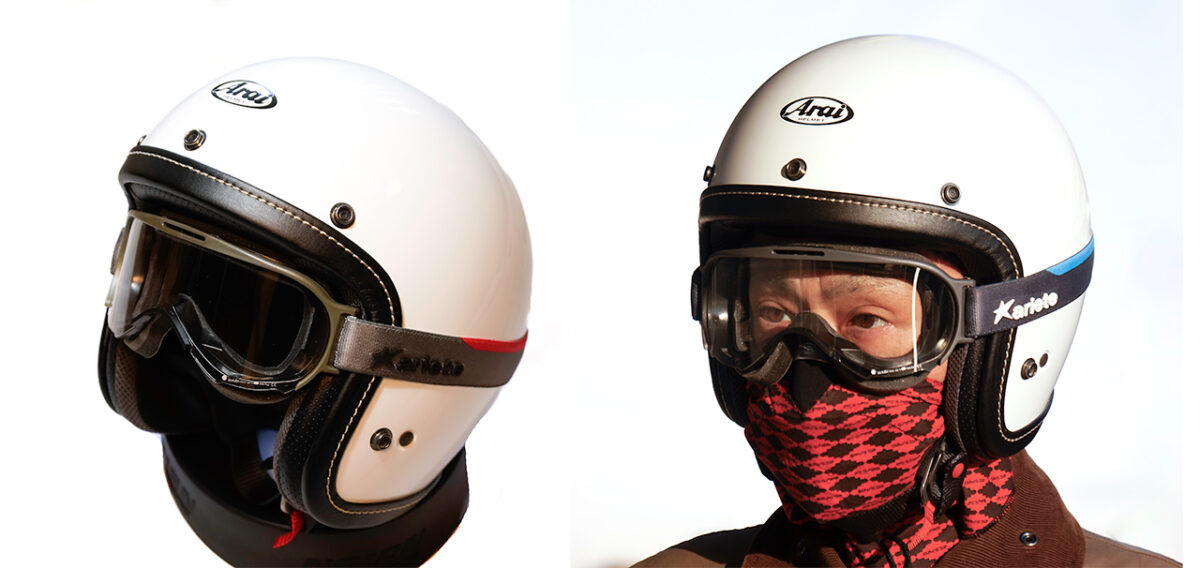 クラシックなデザインは、ジェットヘルメットに装着すればカフェレーサーやビンテージモデルとの相性も非常にいい。