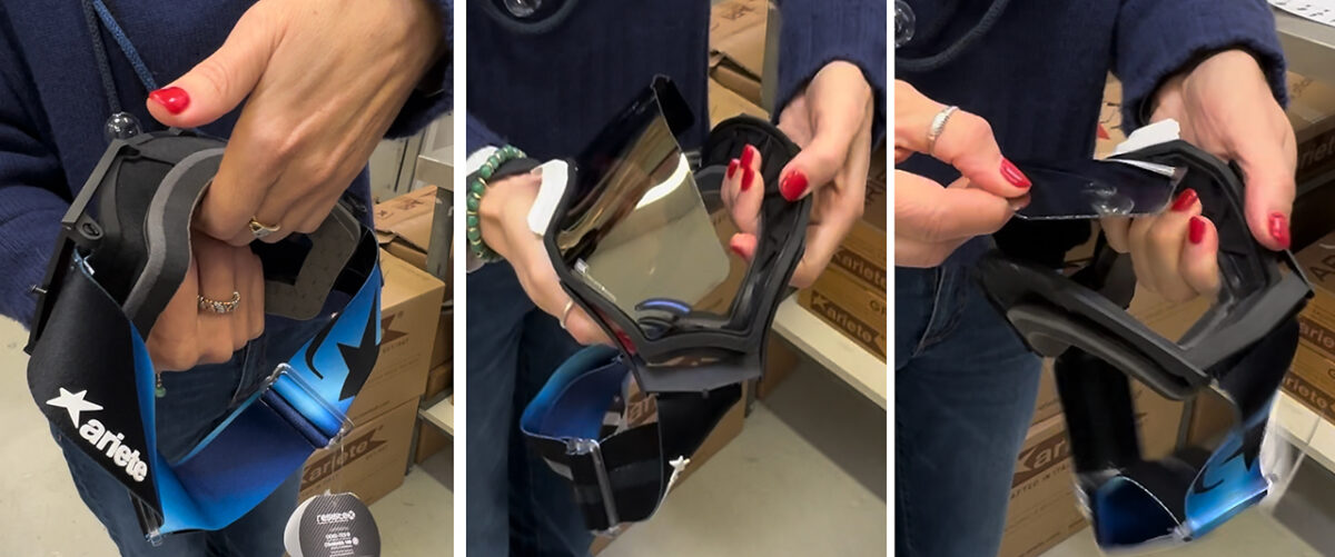 arieteゴーグルは世界レベルのエンデューロレースでプロ選手にも愛用されるオフロードゴーグル。そのため、どのゴーグルも決まった手順を踏めばレンズが簡単に交換できる作りになっている。