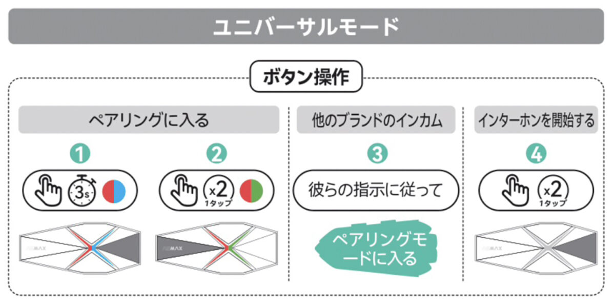 ASMAX F1 Proの電源を入れ、本体後部の機能ボタンを3秒ほど長押しして「ペアリングスタート」と聞こえたら、本体前方のインターホンボタンを2回タップすると、「ペアリングが成功しました」とアナウンスし、ユニバーサルモードになる。