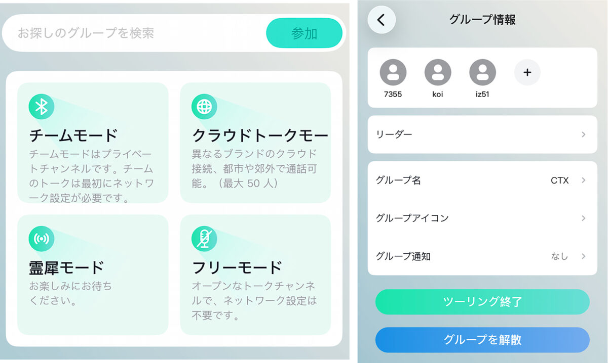 今回は、ASMAX F1 Proの3台をメッシュ接続で最大10人(16人にアップデート予定)のプライベート通話が可能な「チームモード」で繋いだが、同じく「フリーモード」に加え、スマホ回線とクラウドサーバーを介して最大50名が同一ルームでリアルタイムに接続できるCloudTalkモードも用意されている。