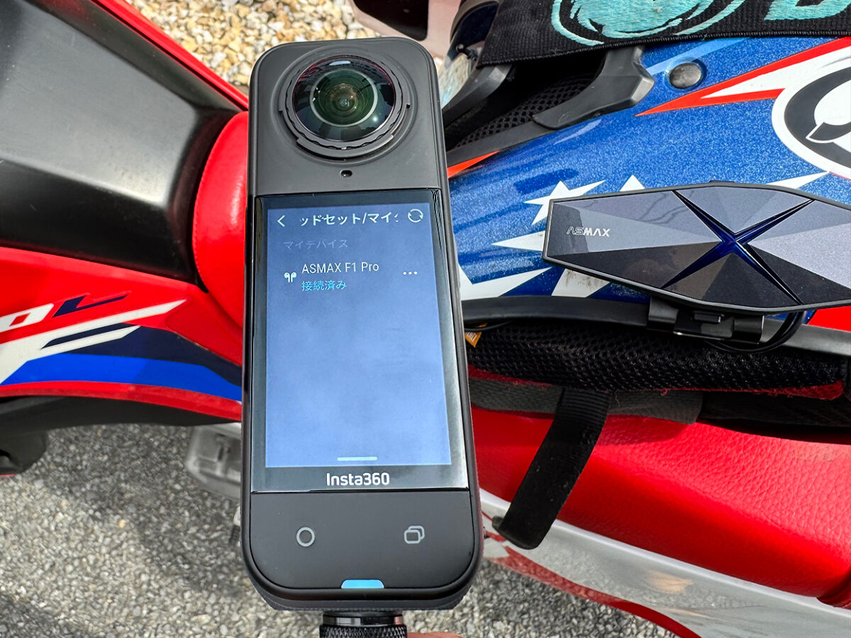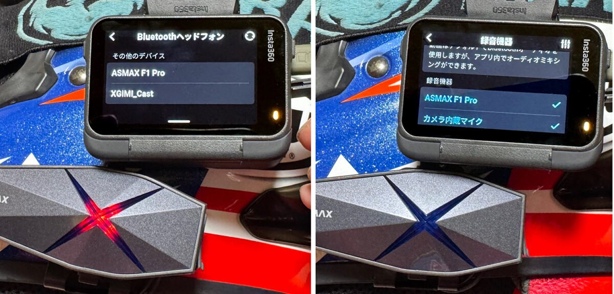 Insta360 X5と接続では、ASMAX F1 Pro側をペアリング待機にした状態でX5の画面を下にスワイプして設定から「Bluetooth」画面を出し、「ASMAX F1 Pro」を選択するだけ。