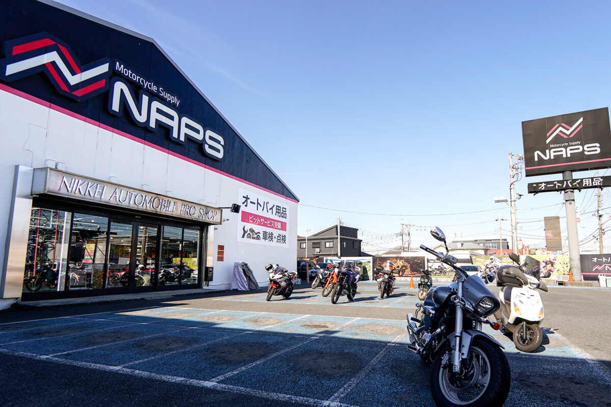 ナップス横浜店は約300坪と広い売場面積にバイクギアやウエア、パーツやデバイスなど豊富にラインナップ。国道1号線沿いという初めても道に迷うことなく行ける好立地に加え、広い駐車場もあるのでツーリングの立ち寄りスポットとしても便利な存在だ。