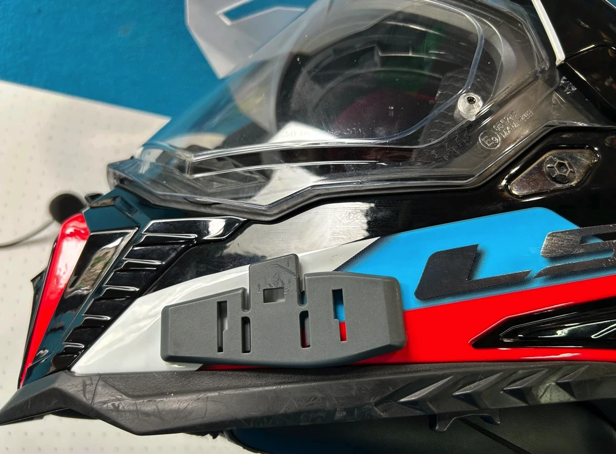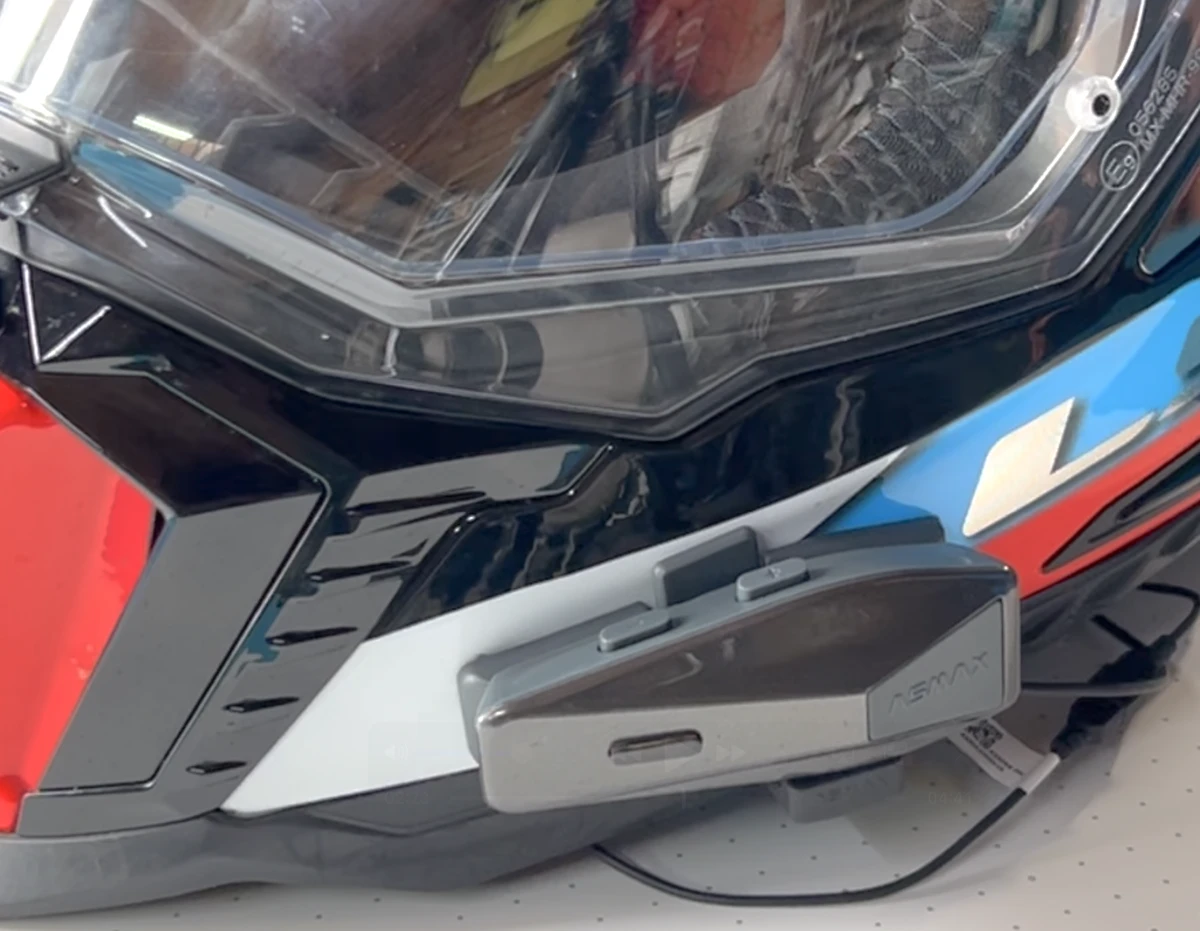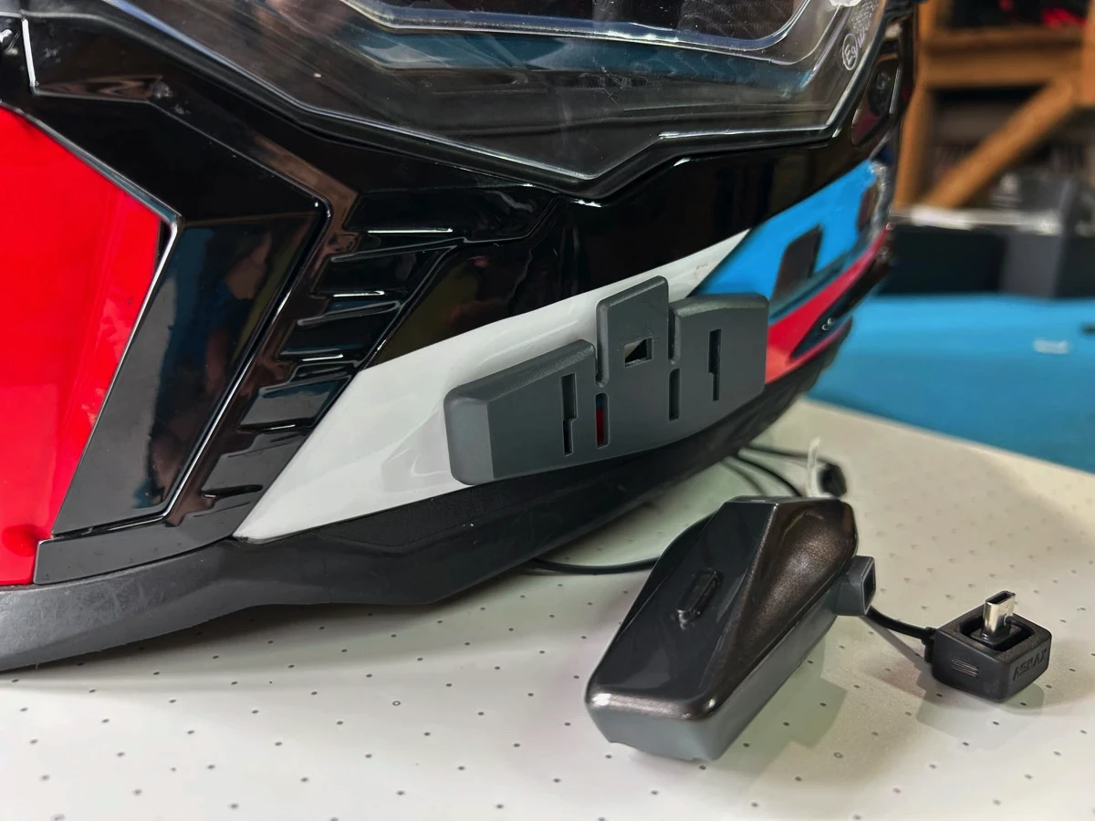 具体的にはヘルメットの左サイドに3M粘着プレートかメタルクランプを設置して、そこに本体を乗せた上でヘルメット内にスピーカーとマイク(フルフェイス or ジェットヘルメット用)を設置します。