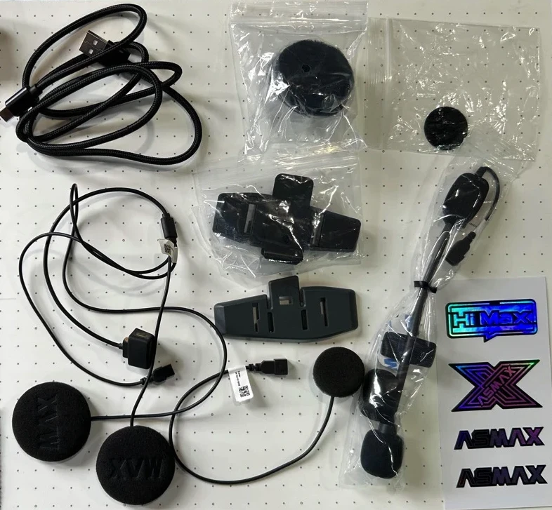 …ということで、まるで某リンゴ帝国のような白を基調とした美しいパッケージを開封すると「3M粘着プレート・メタルクランプ、スピーカー、フルフェイス用・ジェットヘルメット用マイク、充電用USB TypeCケーブル、各種両面テープ類、クリーニングクロス、ステッカー、日本語表記の説明書」が入っておりました。