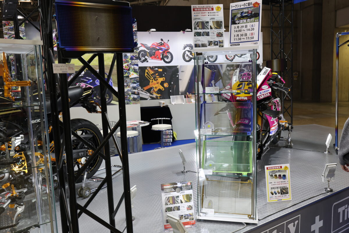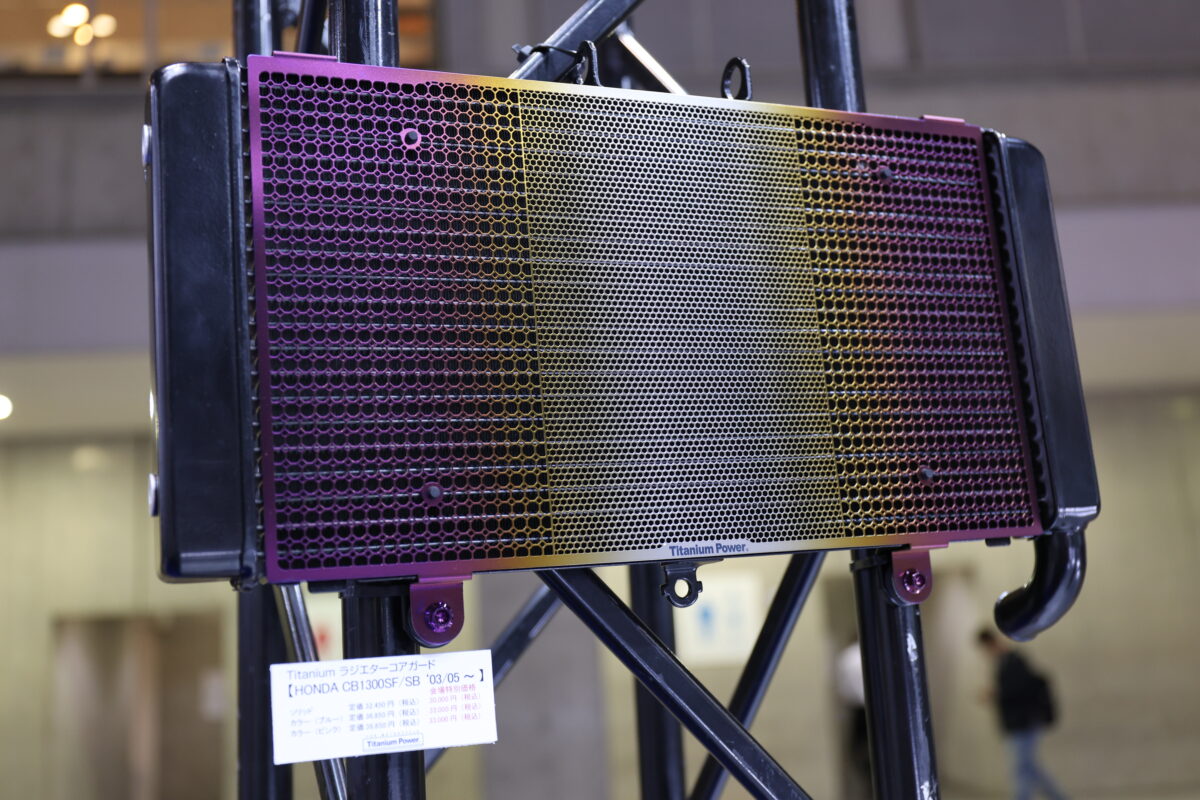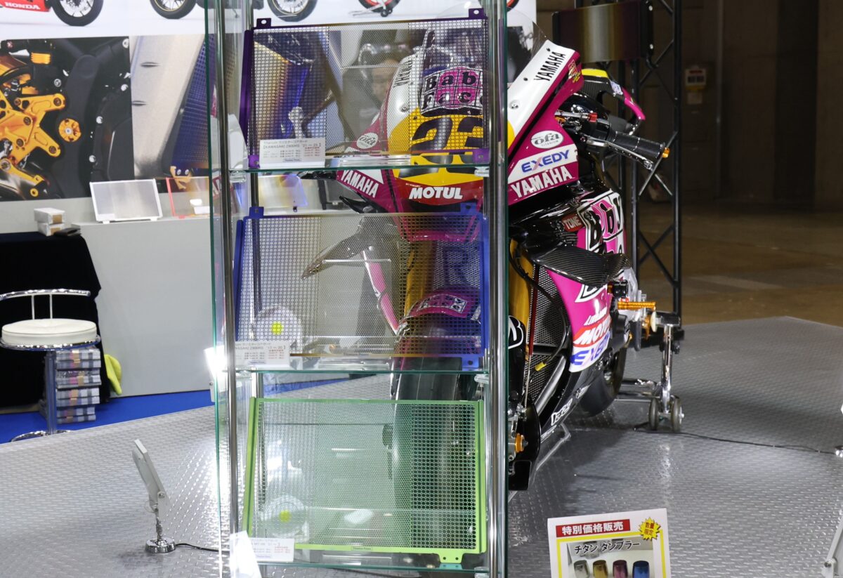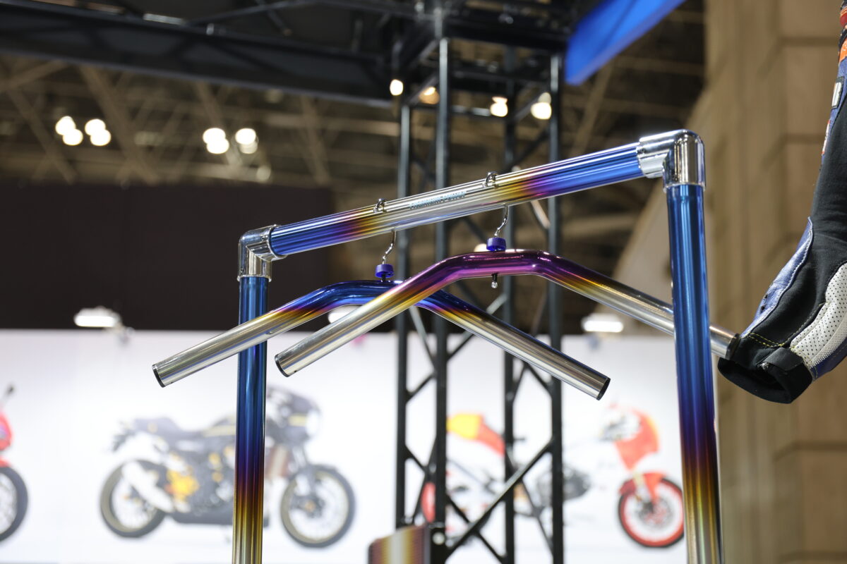 ベビーフェイスのステップに対応するチタンボルトやラジエターコアガードなど、チタン製品を展示。チタン製ハンガー&ハンガーラックも注目を集めていた。
