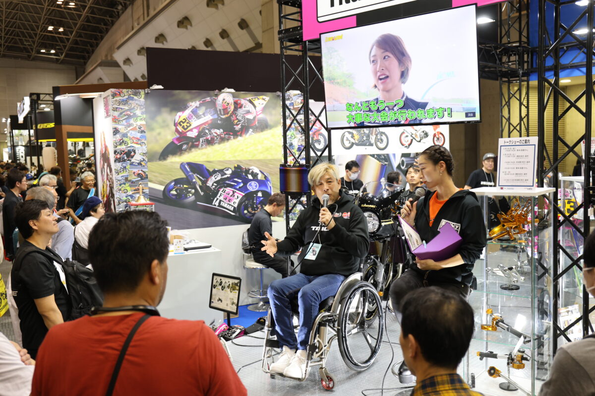 また、サポートライダーの中須賀克行選手や津田拓也選手、そして青木拓磨さんがブース内ステージに登壇し、トークショーを開催。レース活動について、楽しく話をしてくれただけでなく、より多くの方にレースの魅力や製品開発へのフィードバックを伝えていた。
