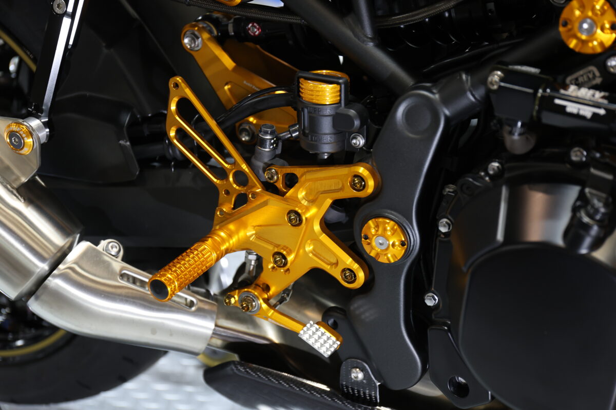 ベビーフェイスの代表的なパーツを挙げるとすれば、まずステップキットを挙げたい。最高の機能とクオリティとデザインを目指した欲張りな逸品。マルチポジションシステムを採用して、自分に合った位置を選ぶことができ、細やかなコントロールが可能となる。ロングツーリングを楽しむライダーは疲れにくいポジションを探すことも可能。スポーティーさだけでなく、オールラウンドに支持される。ステップバーはエンドに至るまで切削ロレット加工とし、雨の日でも足を滑らせる不安のないパフォーマンスを発揮する。デザインや金属加工が醸し出す美しさはとても上質で満足度が高い。