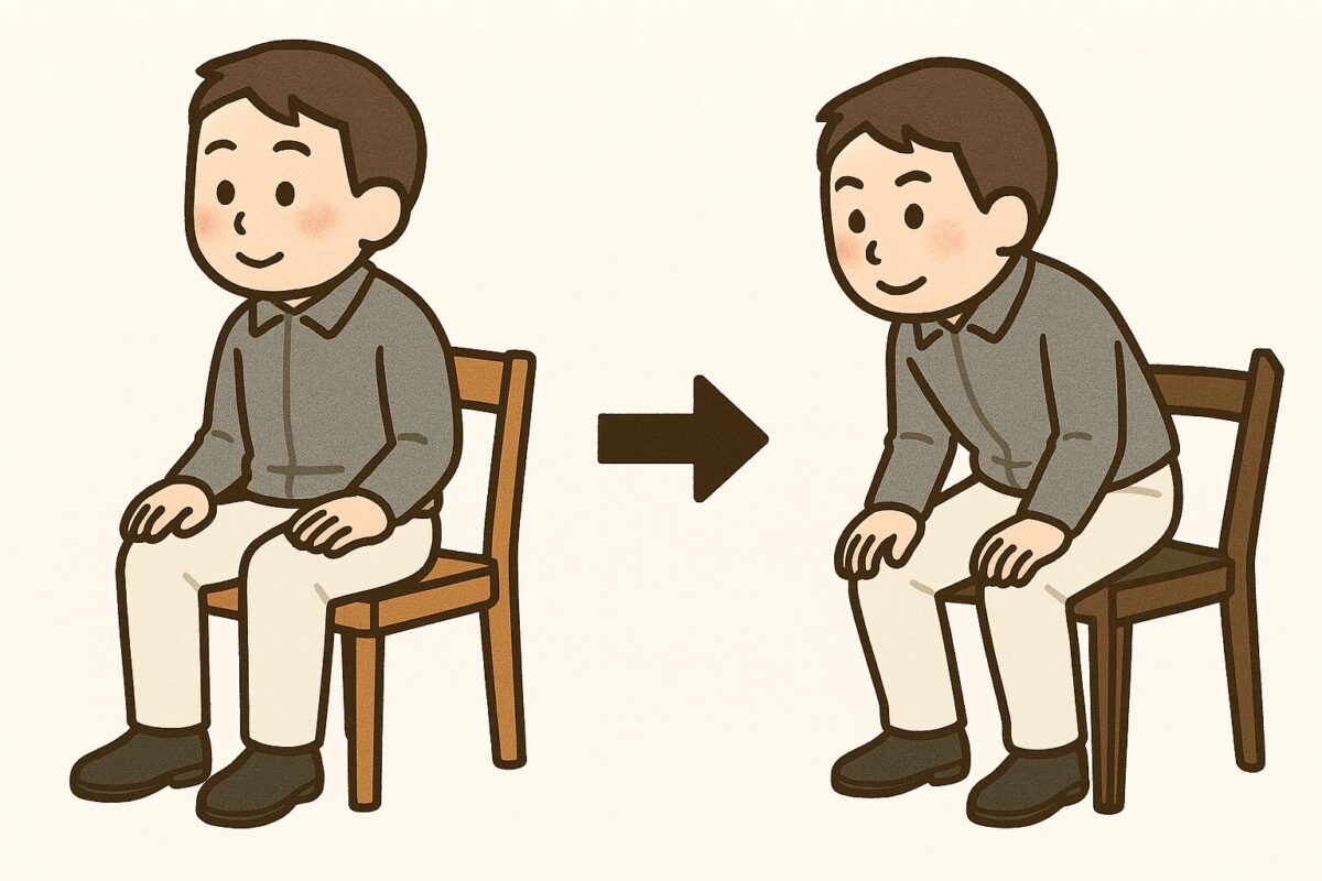 椅子から立ち上がるアクションを想像するとわかりやすい。立ち上がる際は、着座位置の真下に足をつくハズだ。逆に、着座位置より前に足をつくと立ち上がりにくくなる。つまり自由に動けなくなるのだ。