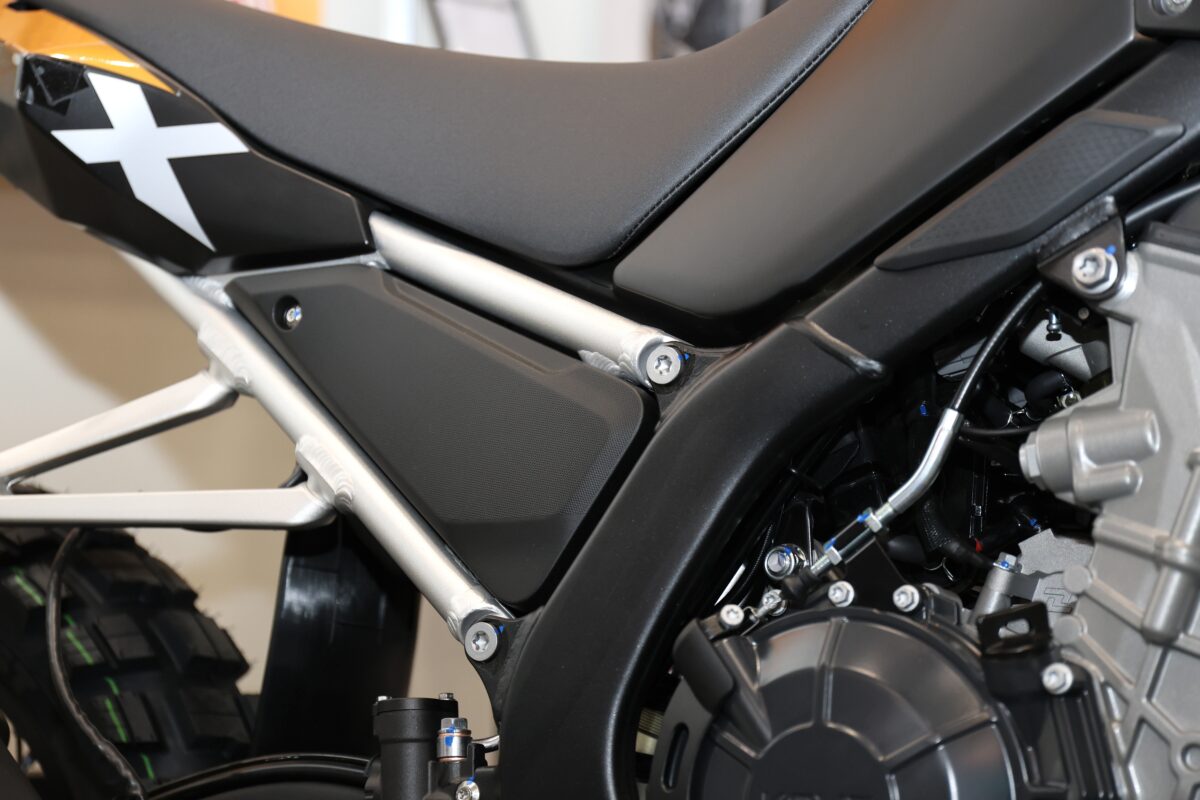 フロントブレーキは大径シングルディスクを採用して軽量化。「オフロードならば制動力も十分だし、シングルの方が軽くて適している」だからだ。一人乗り仕様としてタンデムステップをなくている点も軽量化に一役買っている。注目すべきは後方のサブフレームが脱着でき、交換することも可能なところだ。